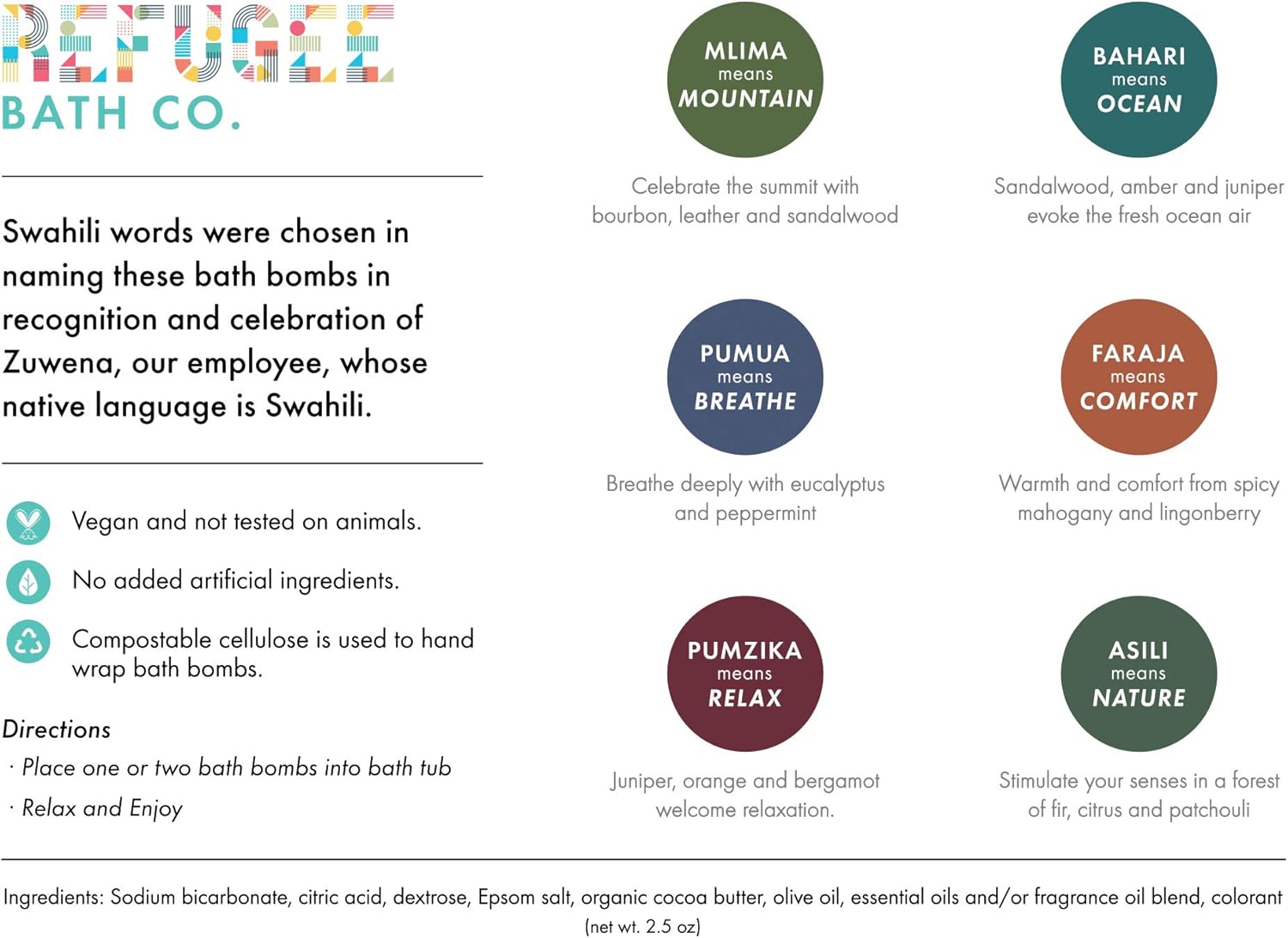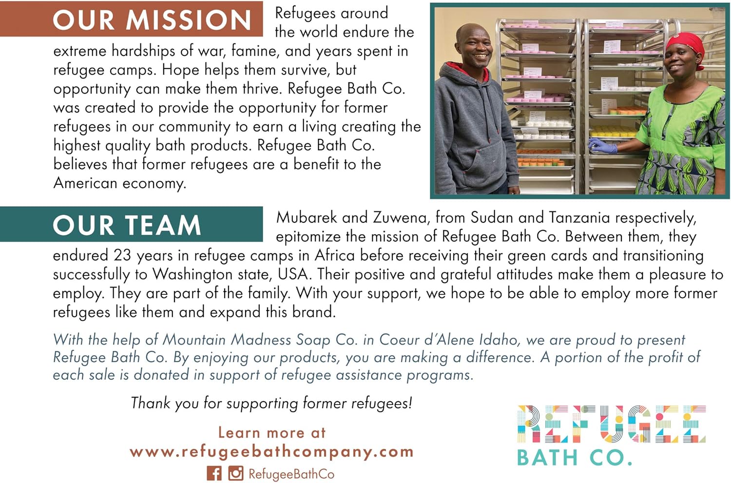 - Refugee Made! Every box contains a "thank you card" explaining more about the individual who made your bath bombs. Each bath bomb is proudly hand-made in Washington State by refugees in our community. Our primary mission is to celebrate and welcome refugees in our community by providing employment.