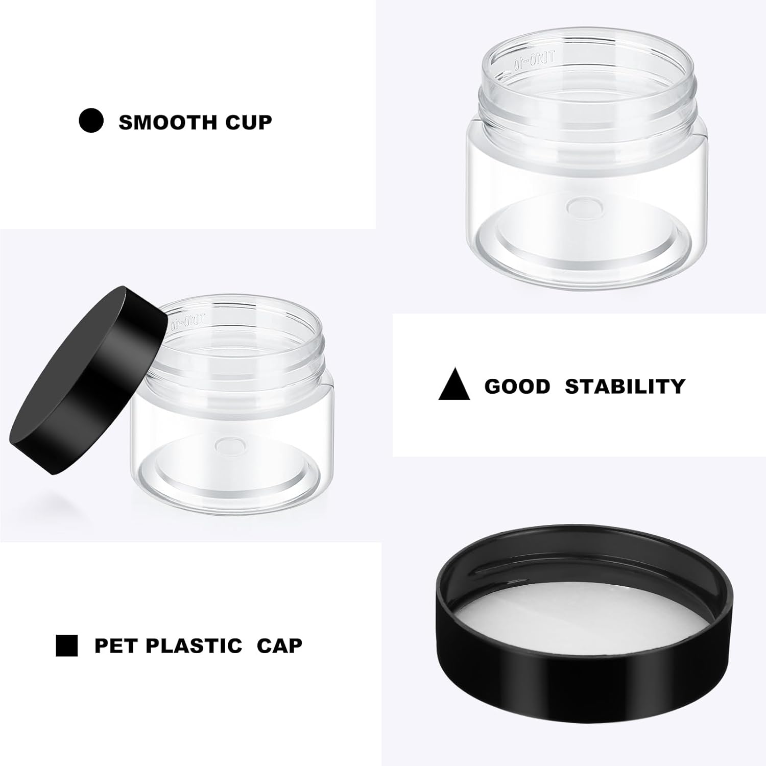 - Quality material: the 0.17 oz plastic jars with lids are made of quality clear plastic, without odd smell, does not contaminate your skincare products, stable, high temperature resistance, a black plastic cover with lid, sealed storage and leak proof