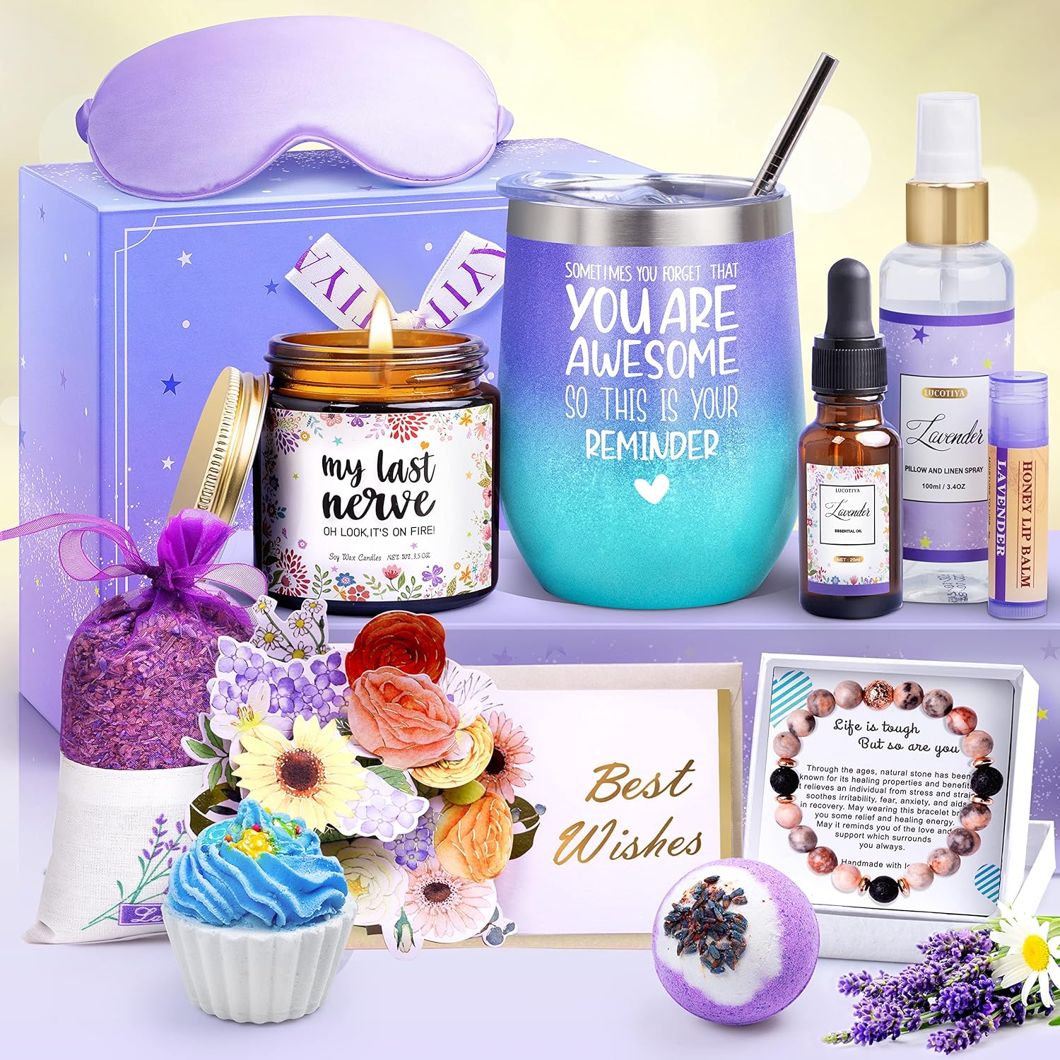 - LUCOTIYA Lavender Pamper Gifts Baskets!-Our self care gifts for women include everything you need for a complete,pampering time! Each set comes with: Lavender Pillow and Lien Spray,Silk Eye Mask, Lavender Sachet, Lip Balm, Lavender Oil, Bracelet, Aromatherapy Bath Bomb*2 , Scented Candles,Greeting Card and Wine Tumbler.
