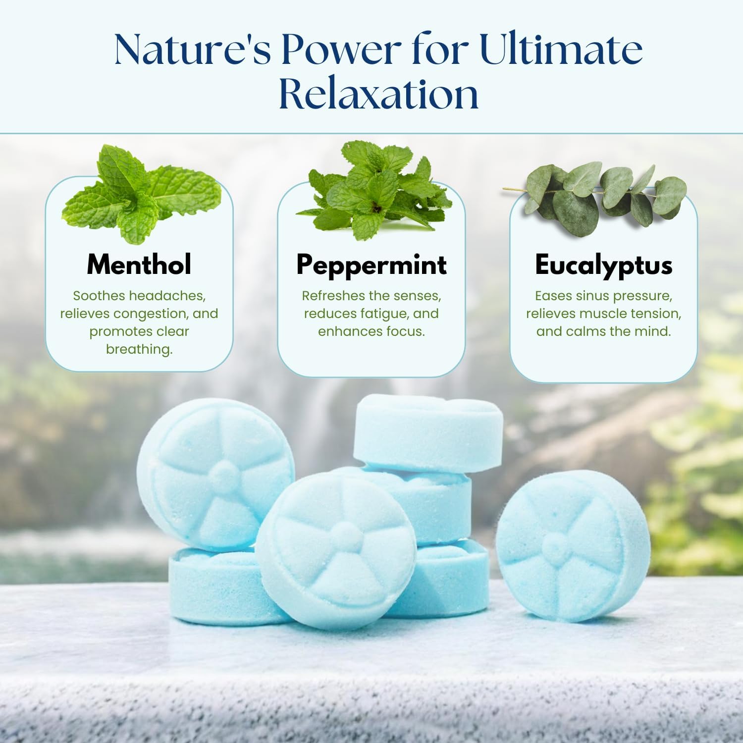 - 100% NATURAL ESSENTIAL OILS FOR RELAXATION & RELIEF: Crafted with premium essential oils, our shower steamers feature a therapeutic blend of menthol, peppermint, and eucalyptus. These natural ingredients work together to open your airways, relieve congestion, and promote deep breathing. Whether you're looking to unwind after a long day or ease seasonal allergies, our spa shower tablets provide the perfect combination of aromatherapy and relaxation in your daily routine.
