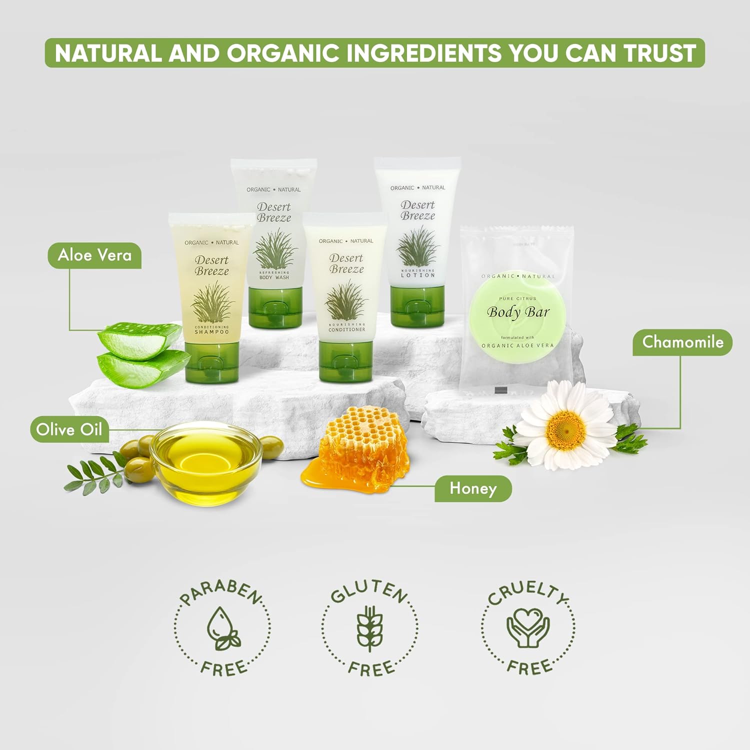 Desert Breeze Hotel Soaps and Toiletries Bulk Set | 1oz Hotel Shampoo & Conditioner, Body Wash, Body Lotion & Bar Soap | Full Pallet 49 cases with 300 units each - 14,700 pieces