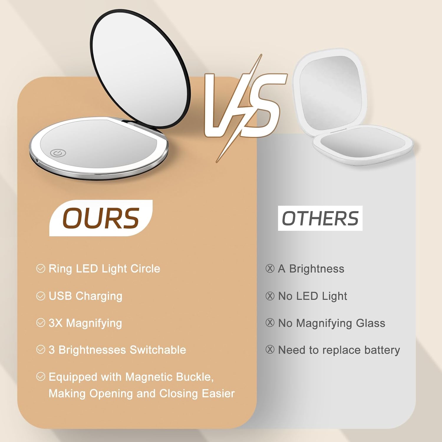 - [Stay Beautiful All The Time]--Our pocket mirror is lightweight, compact, easy to carry, and equipped with a USB cable, so you don't have to worry about changing batteries at any time. It is the perfect companion for you on the road. Whether in between makeup sessions or on the go, it can create a sophisticated and flawless look, allowing you to look confident and beautiful in any occasion.