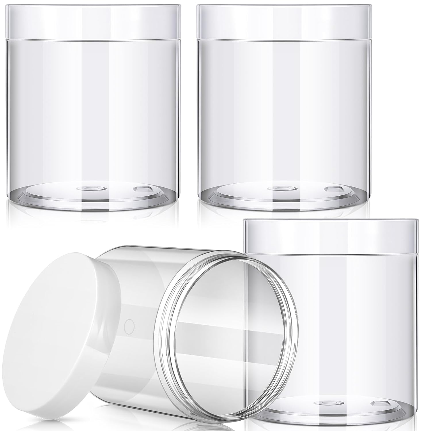 - What you receive: there are 4 pieces plastic jars with white screw-on lids; They are reliable and refillable, measuring about 16 oz in capacity