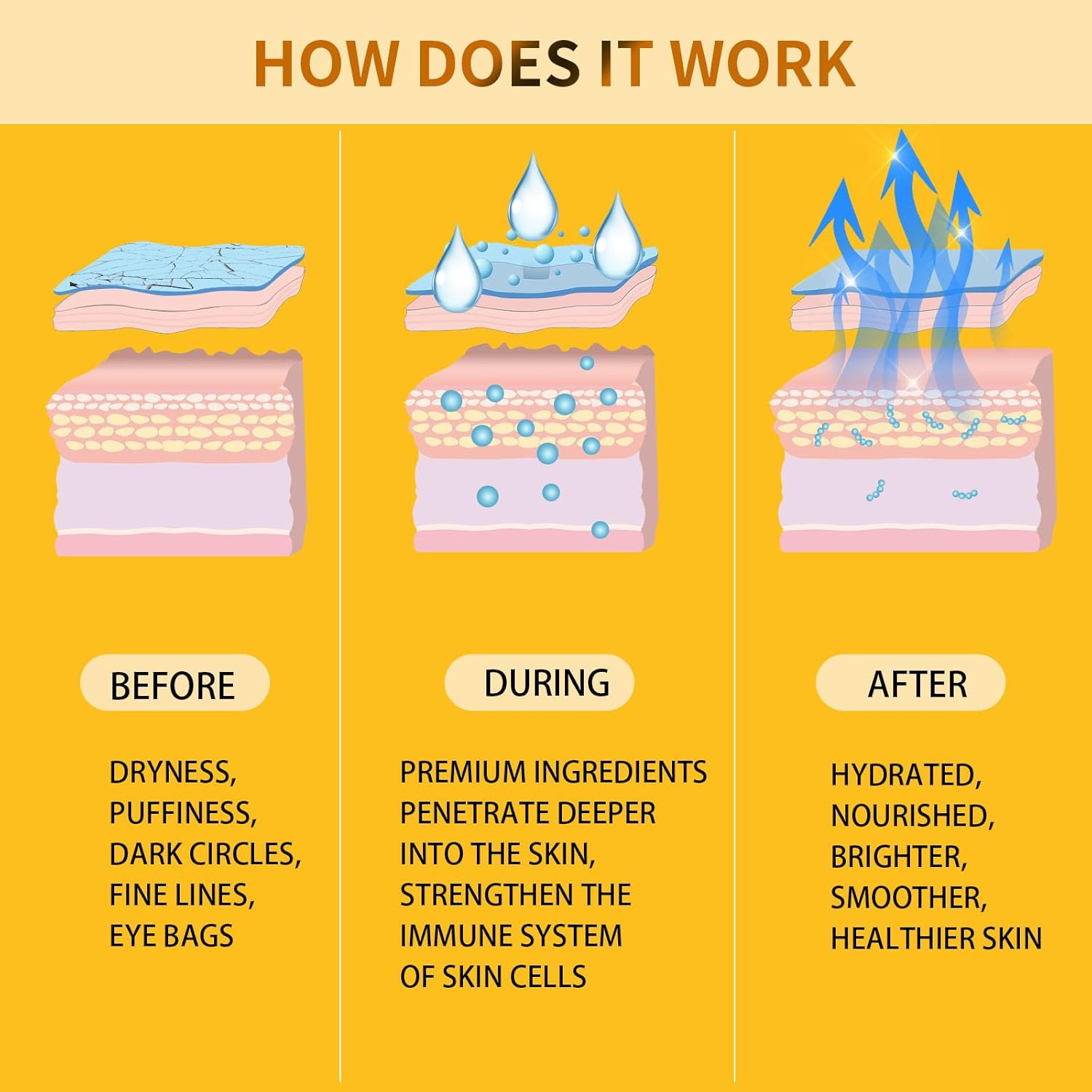 - Tips: Store the under eye masks in a cool, dry place at temperatures between 0℃/32℉ and 45℃/113℉, and shield it from direct sunlight. Extreme heat or cold can harm the product. For optimal results, we recommend using the eye patches for wrinkles daily. Placing the gel eye pads in the fridge for a short period before use can enhance the experience, but please refrain from freezing them.