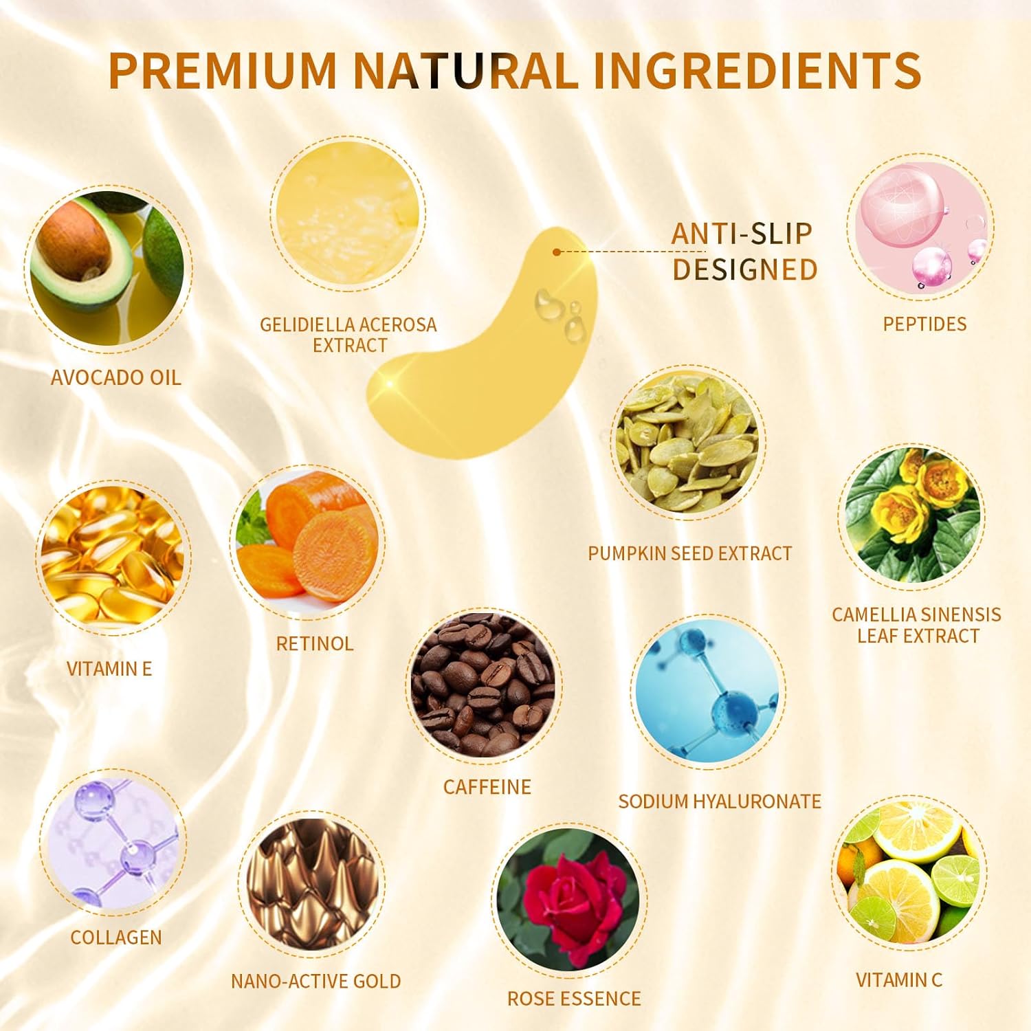 - Our Advantages: Our premium 24K gold eye masks are developed by a Korean cosmetic laboratory. They contain a blend of natural ingredients, including 24K Nano Gold, Collagen, Sodium Hyaluronate, Gelidiella acerosa extract, Avocado oil, Camellia sinensis leaf extract, Vitamin C, Retinol, Vitamin E, and Rose essence. These ingredients are highly effective for eye bag remover, gold eye patches for puffy eyes, eye mask for puffiness, eye mask skincare and under eye bags treatment for women and men.