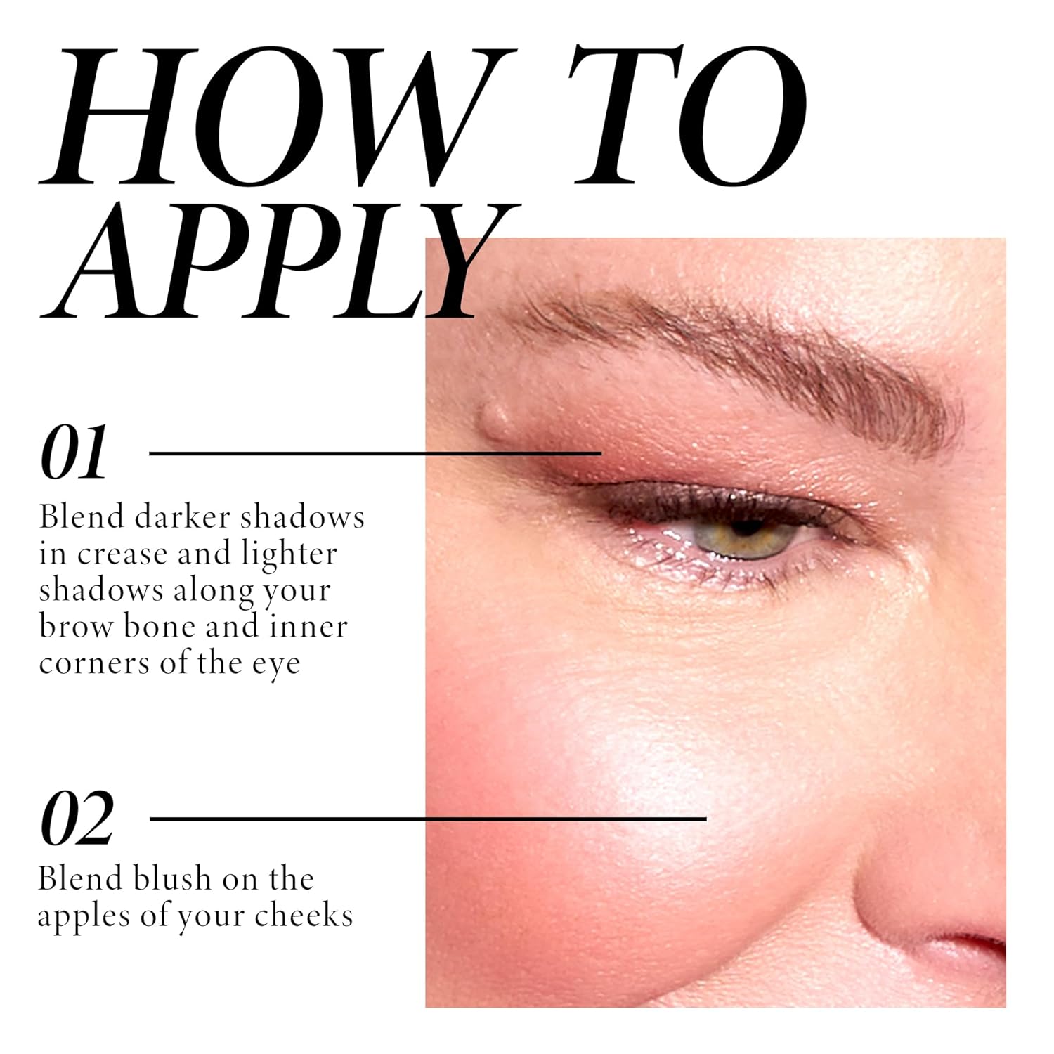 - HOW TO APPLY: Start by sweeping the blush on the apples of your cheeks and blending outward and upward. As for the eyeshadows, blend darker shades in the crease and lighter hues along the brow bones and inner corners of the eyes using a fluffy eyeshadow brush.