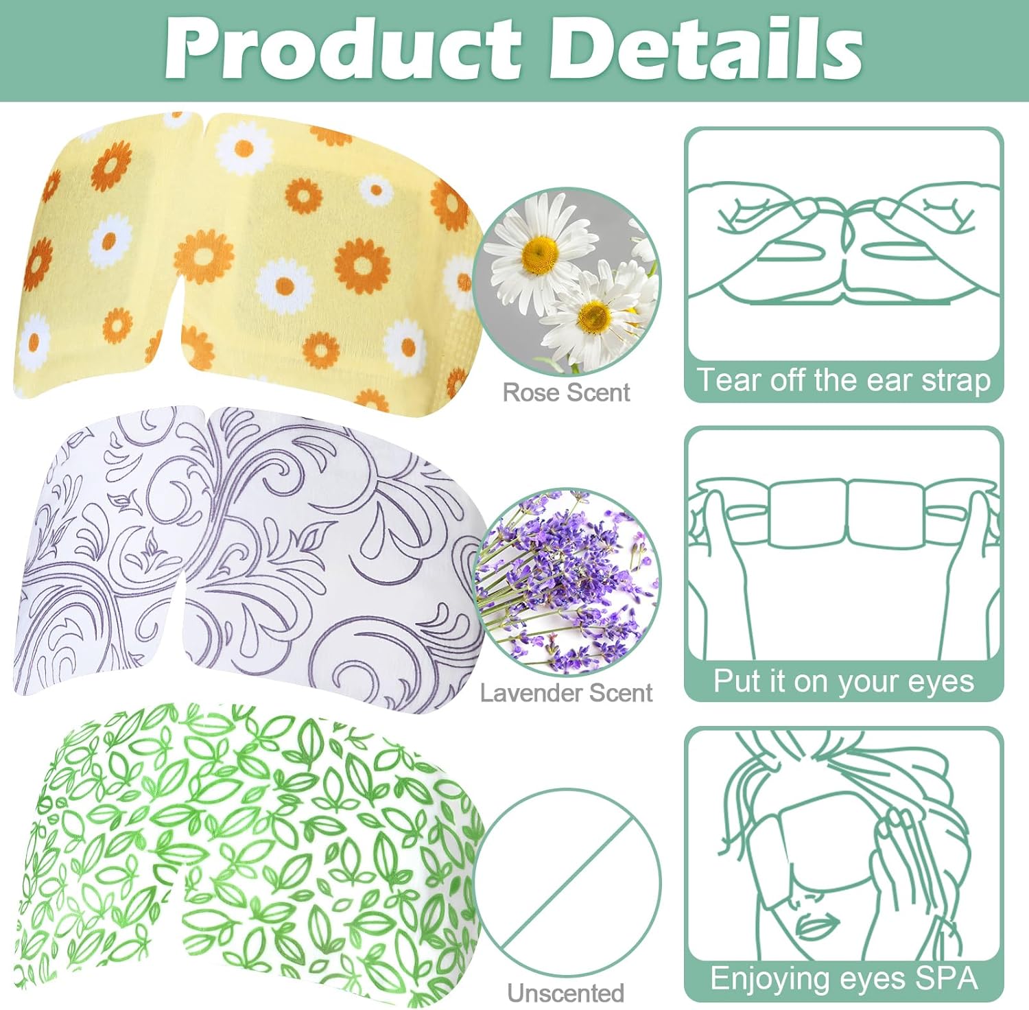 - Reliable Material: these steam eye masks disposable are made of quality non woven fabric, soft, breathable and safe to use; They are designed with elastic ear straps for a snug fit; 3 Styles eye mask bulk allow you to choose your favorite ones and keep your eyes relaxed freely
