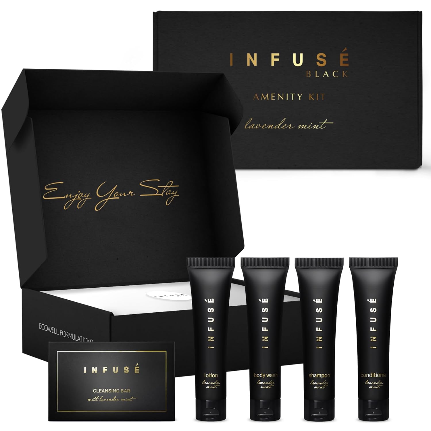 - WHY CHOOSE INFUSE BLACK? Our high-end formula & environmentally friendly beautiful design bring elegance to any upscale rental or vacation property. Our travel size, pump, and gallon toiletries are paraben-free, gluten-free & made with lavender mint for soft skin & hair! We offer a range of products and cater to all your on-the-go personal care needs.