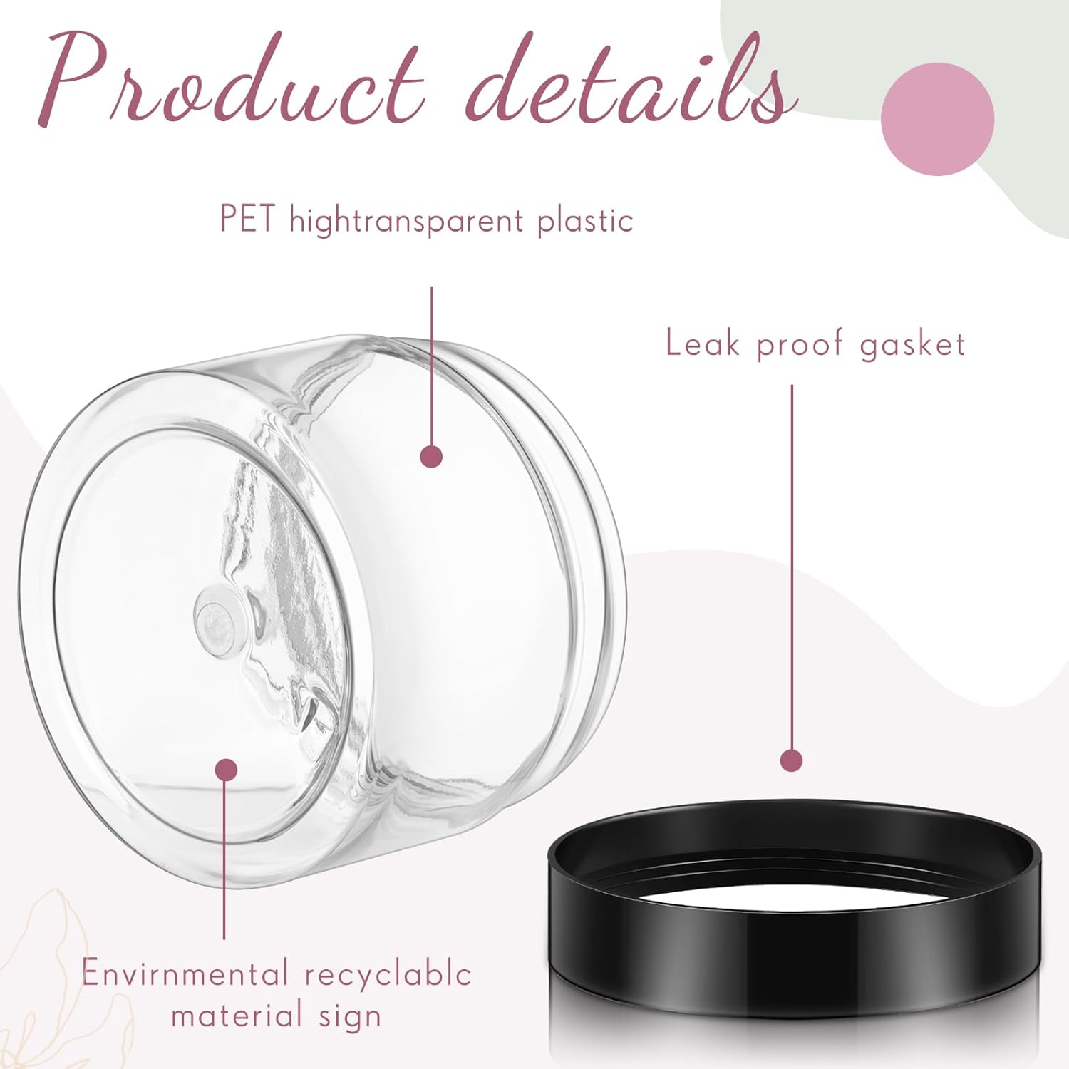 - Quality material: the 4 oz plastic jars with lids are made of quality clear plastic, without odd smell, does not contaminate your skincare products, stable, high temperature resistance, a black plastic cover with lid, sealed storage and leak proof