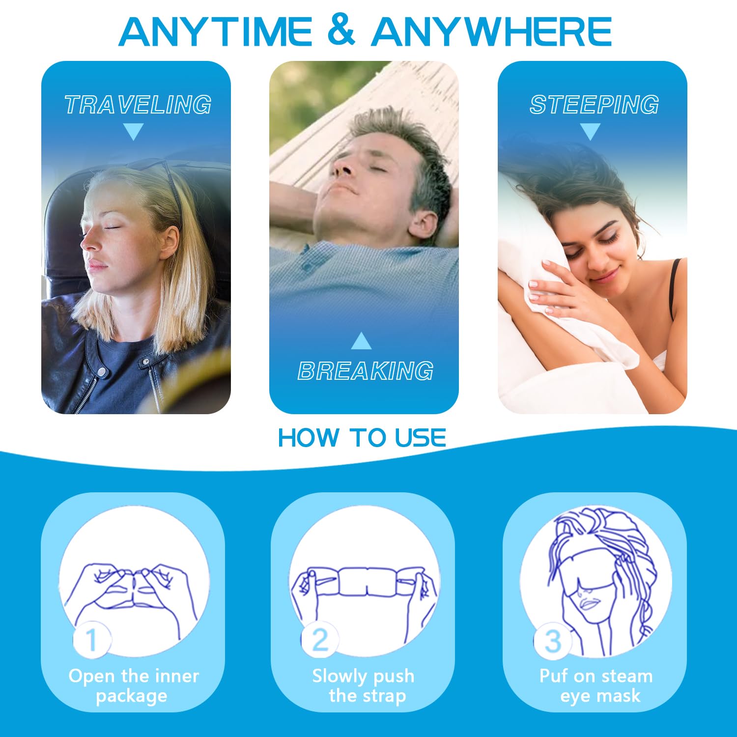 - [Versatile for All Occasions ] - The lightweight and portable steam heat eye masks are effortless to carry. Widely applicable in daily life for office workers, students, businesspeople, and travelers. You can relish an eye SPA whenever you wish: at bedtime, during leisure moments, for a noontime snooze, while traveling on planes or trains, or during office breaks.
