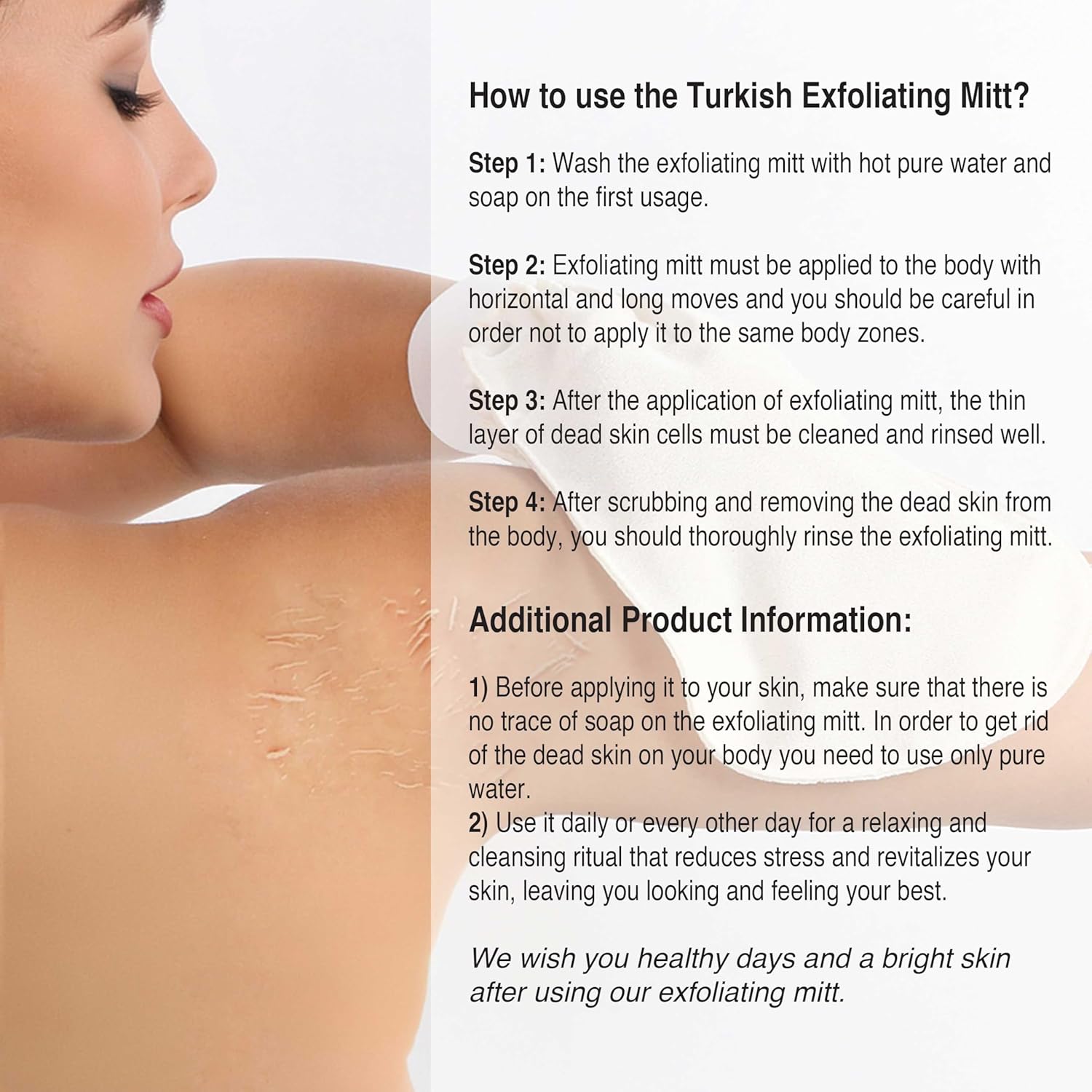 - Deep Cleansing & Exfoliation: Transform your skincare routine with our Turkish Exfoliating Mitts and Back Scrubber Set. Designed for gentle yet effective exfoliation, these tools cleanse deeply, leaving your skin feeling refreshed and invigorated after every shower. By removing dead skin cells and dry flakes, they help unclog pores and promote a healthier, more radiant complexion without causing irritation.