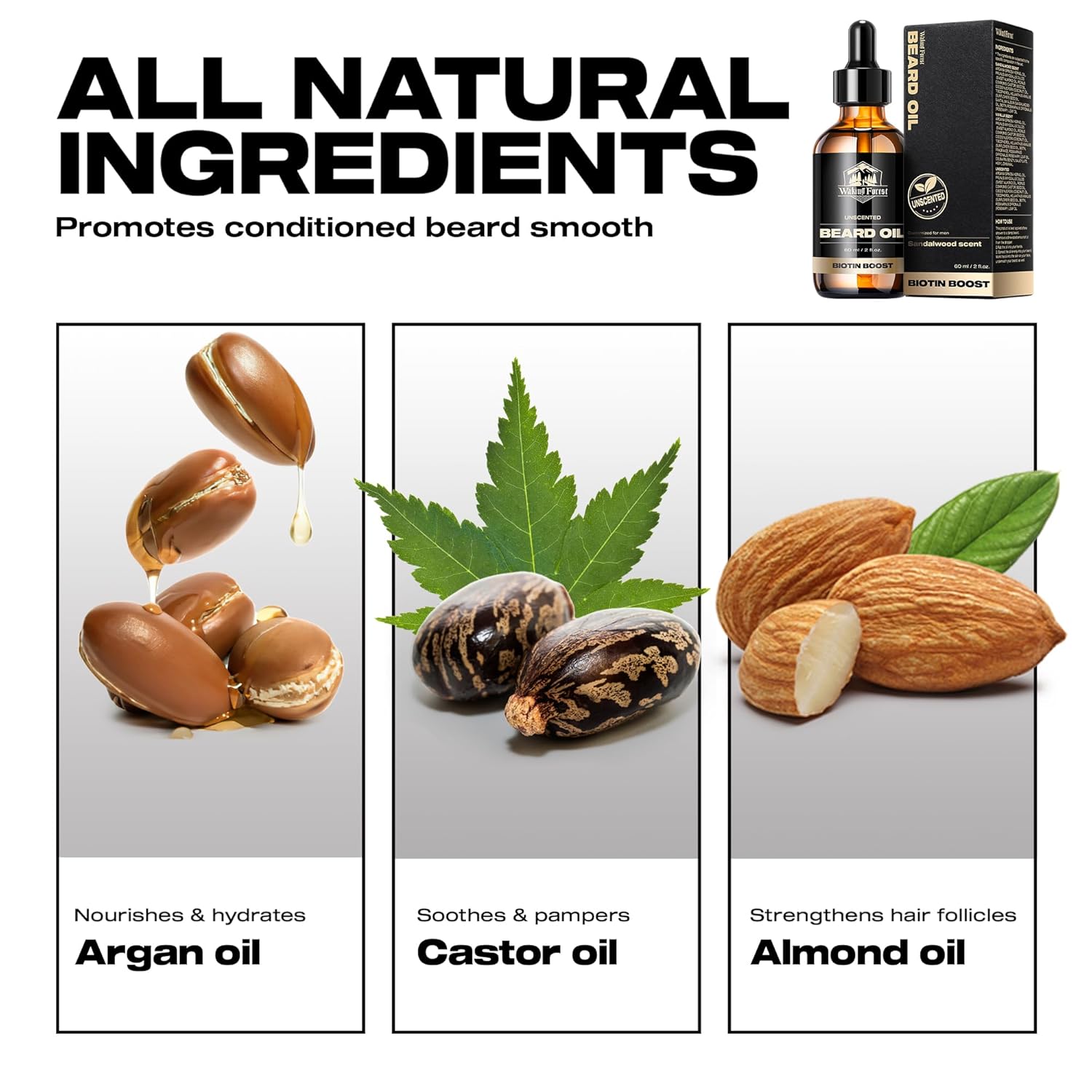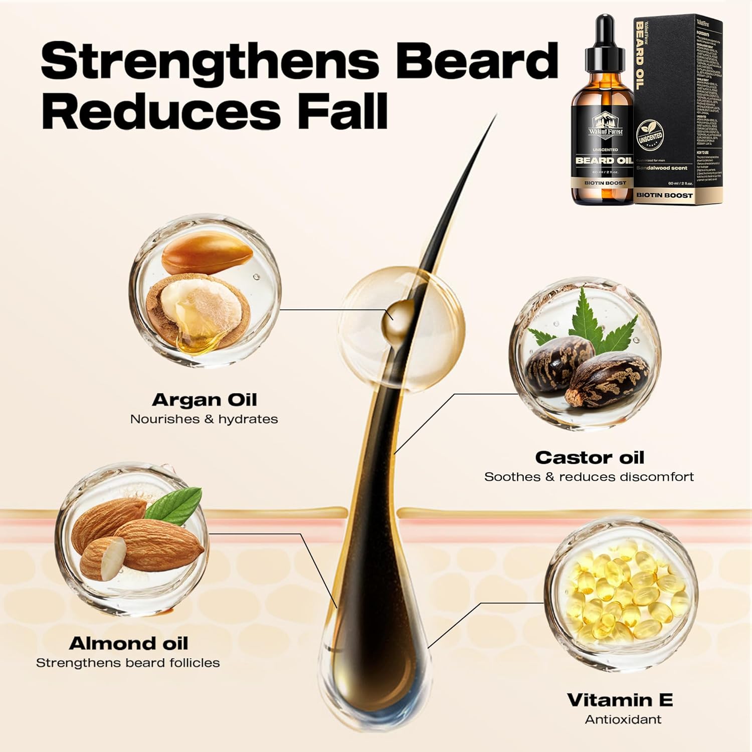 Waking Forest Beard Oil - 60ml Unscented Biotin Beard Oil for Men Thicker Beard with Vitamin E, Rosemary, Castor Mustache Oil for Black Men, Softens & Strengthens Beard Care Oil