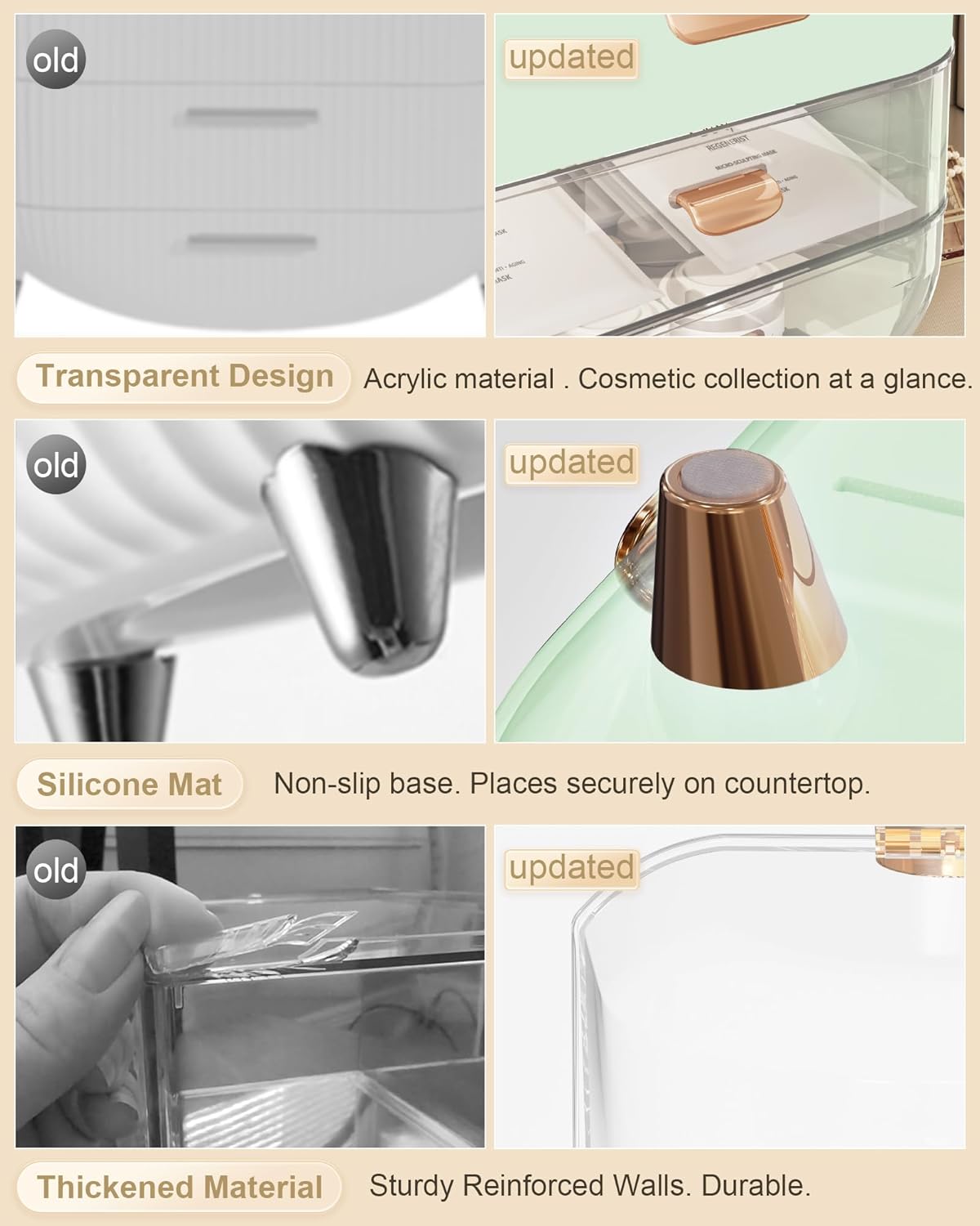 - ăThickened Material & Non-slipăReinforced and upgraded handle won't fall off. Easily move the skin care organizer to anywhere. The countertop organizer is made of thickened ABS material, which is stronger and more durable than normal ones. Drawer and clear top are able to open and close easily. Rubberized bottom, non-slip and won't scratch desktop.