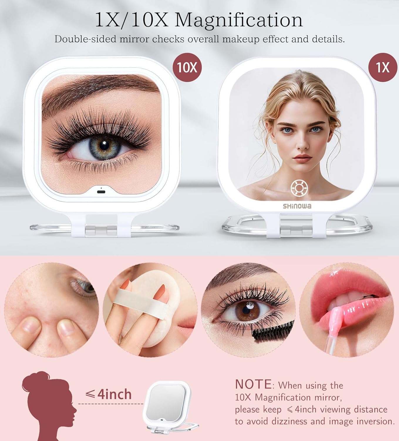 - 10X/1X Magnification Mirror: This travel makeup mirror features a double-sided design with 1X and 10X magnification. The 1X side is suitable for overall makeup and daily skincare. The 10X side zooms out your makeup details when applying eyeliner, mascara, or grooming eyebrows for a flawless and delicate makeup look. NOTE: When using the 10x magnifying mirror, please keep the mirror ≤ 4 inches or closer to your face.