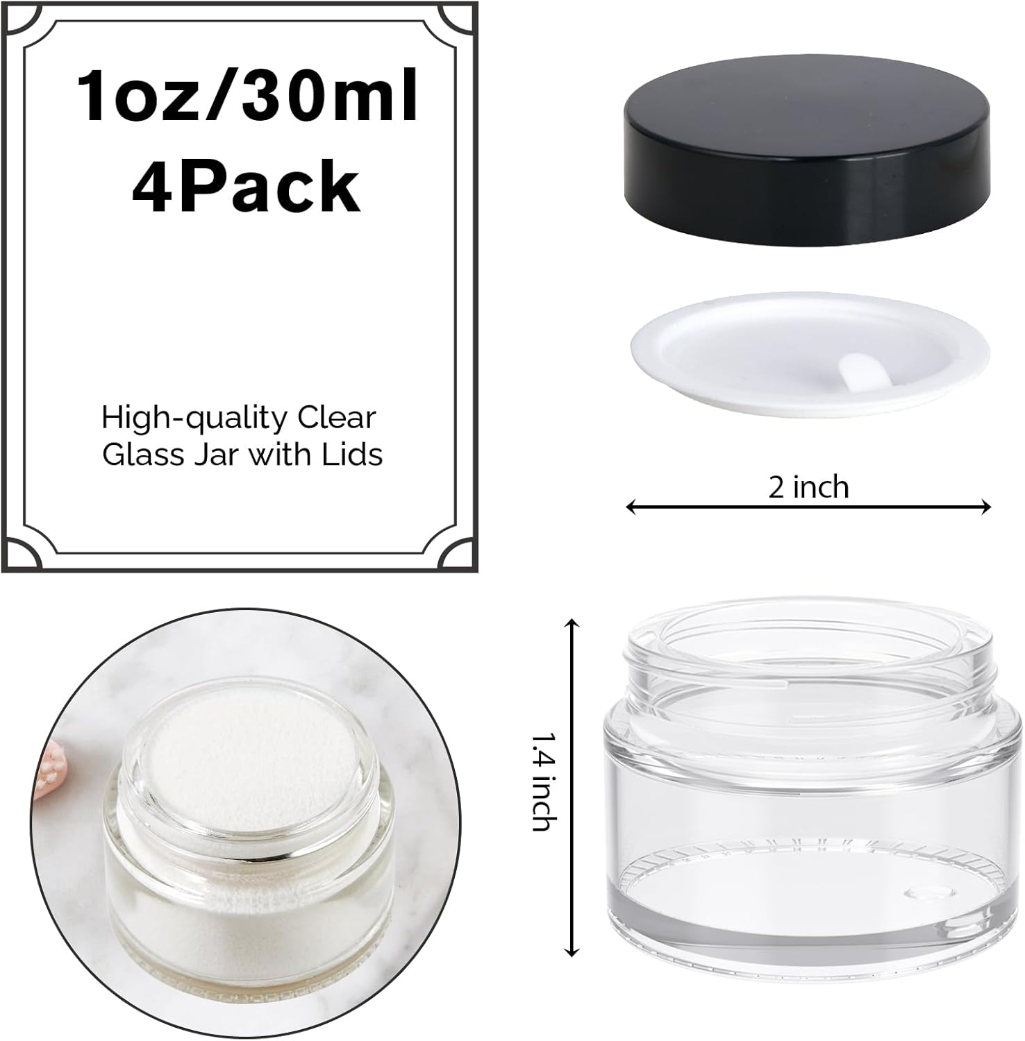 1oz Jars with Lids, HOA Kinh 4 Pack Clear Glass Jars Empty Cosmetic Containers Round Airtight Glass Jar with Inner Liners and black Lids for Storing Lotions, Powders, and Ointments