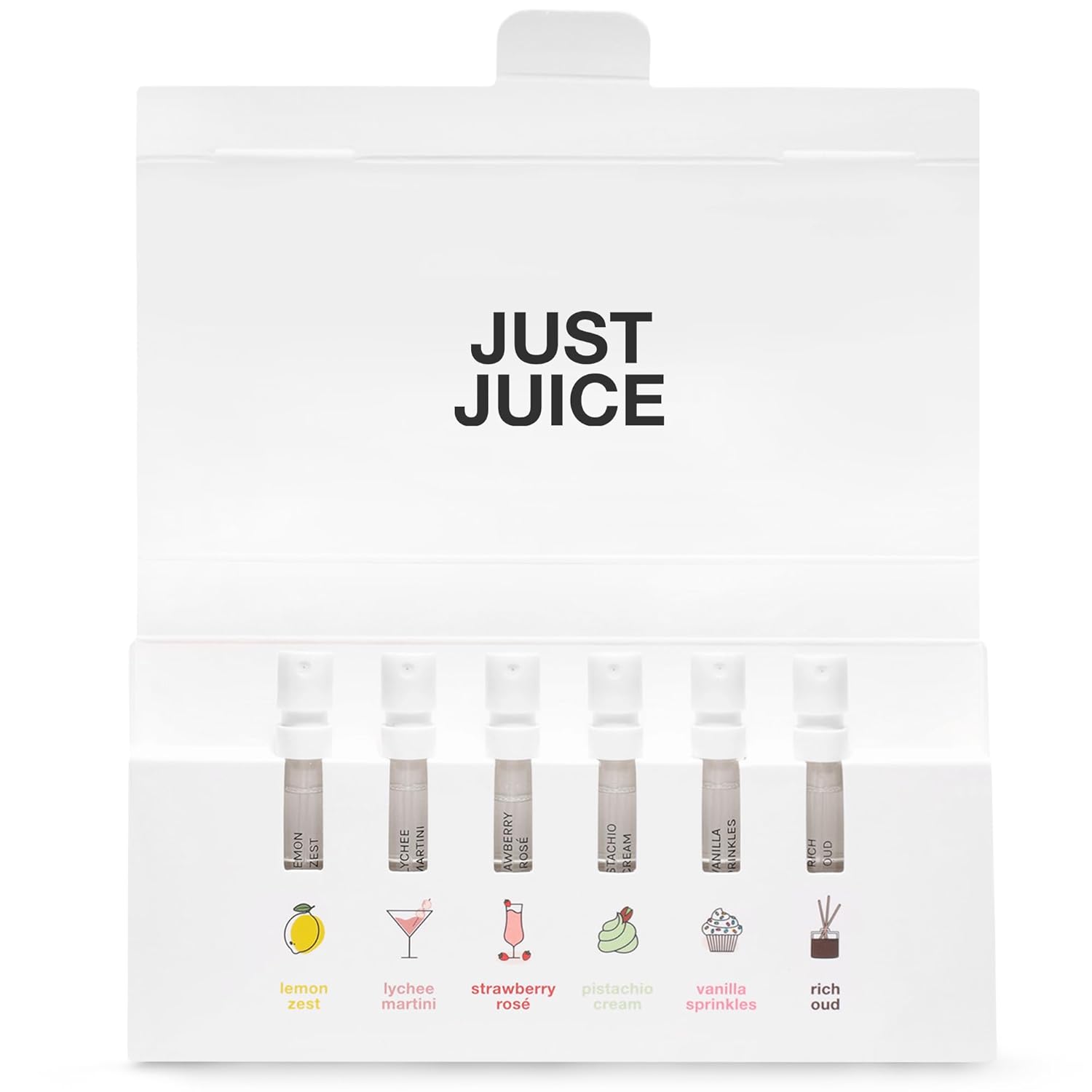 - Find Your Favorite: Enter the world of Just Juice fragrances with this pocket-sized discovery collection, featuring 6 sprayable vials for effortless experimentation. Wear alone or layer. The possibilities are endless.