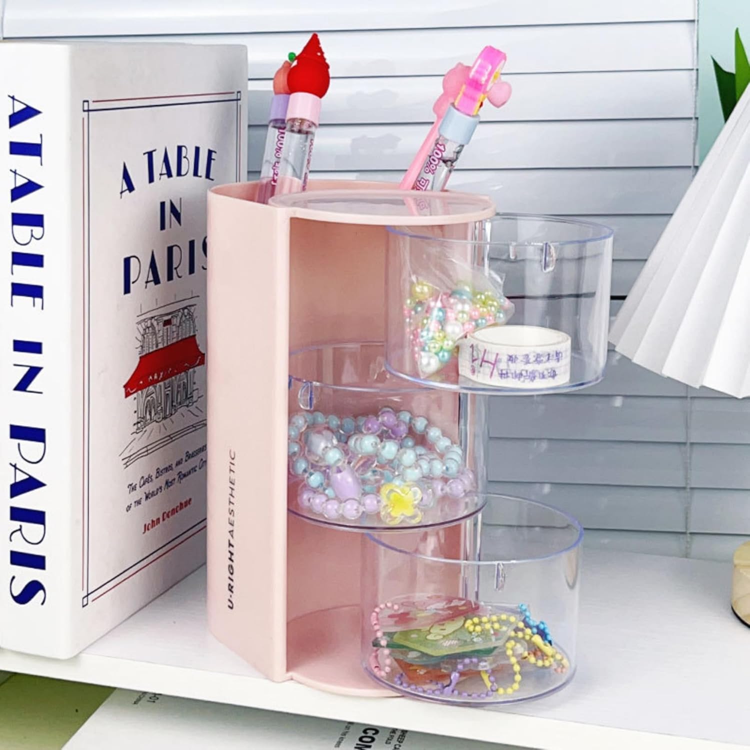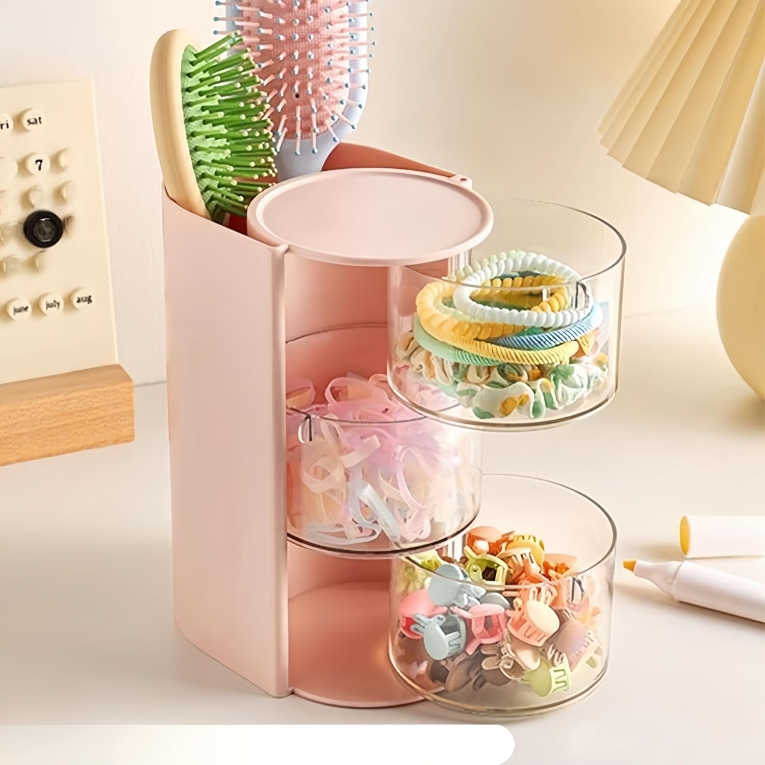 Hair Accessories Organizer with Hair Brush Holder, Rotatable Makeup Brush Holder for Necklaces, Earring, Bracelet, Ring, Makeup Brushes, Hair Clip and Hair Accessories (Pink, 3-Layer)
