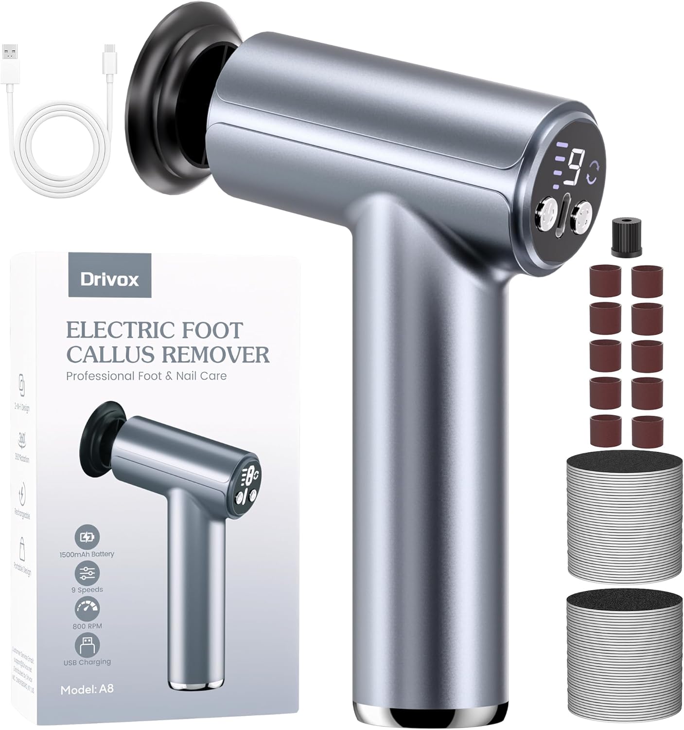 - 【Rechargeable Callus Remover For Feet】Drivox electric foot callus remover built-in 1500mAh lithium battery, provides more than 150 minutes of continuous working time, fully charged in 2 hours. The compact cordless design is perfect for bathroom, salon or travel use