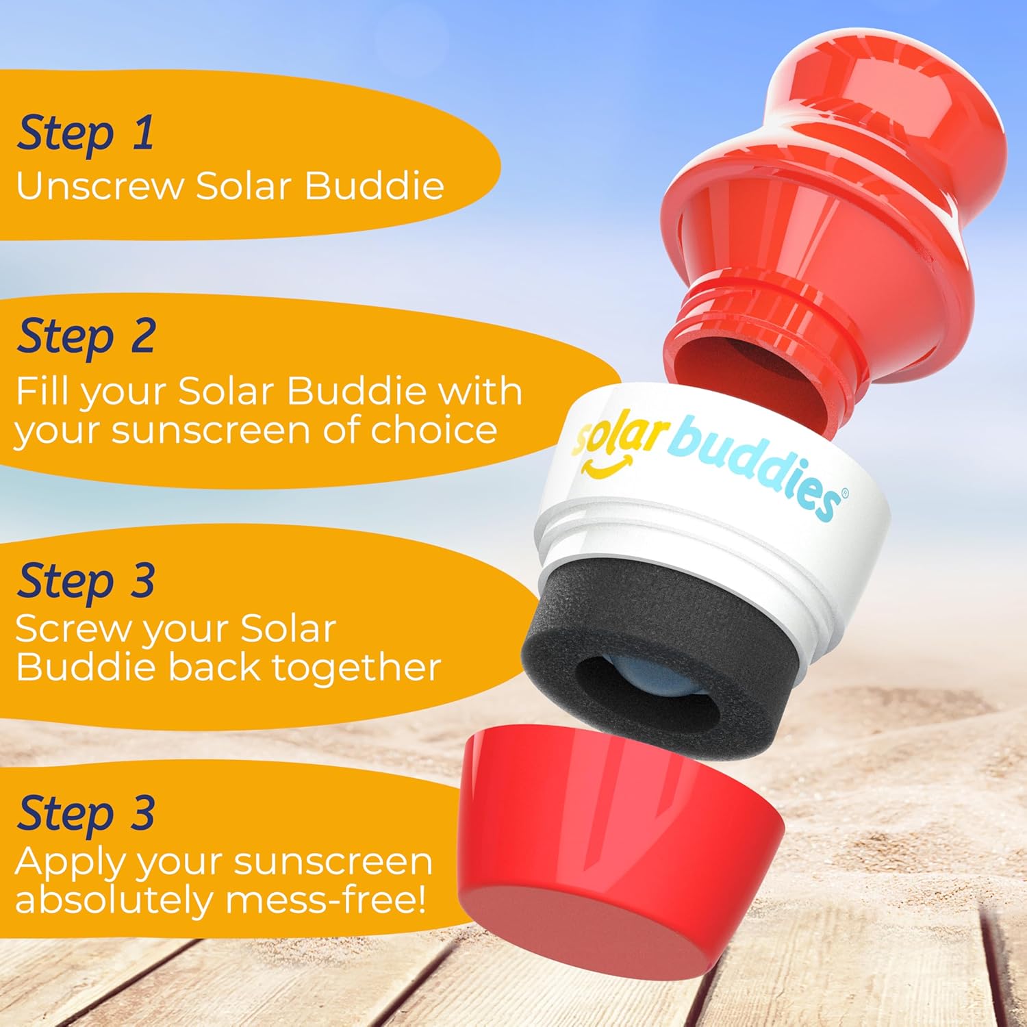 - PERFECT TRAVEL SIZE: Perfectly sized for on-the-go use, it holds 100ml or 3.4fl oz, fitting comfortably in your hand luggage. A clearly marked 100ml indicator under the yellow neck of the bottle helps you stay within liquid carry-on limits. Featuring a practical clip, it easily attaches to school bags, handbags, or gym bags, ensuring you have your buddy wherever you are. The Solar Buddies Sunscreen Applicator is a travel essential for kids!