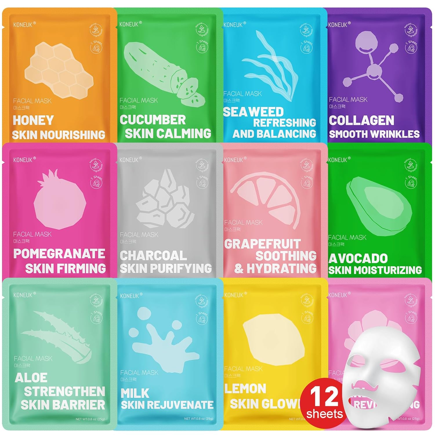 - 【12 Pack Face Mask Set】Our face masks skincare includes 12 types: seaweed,aloe,collagen,grapefruit,honey,avocado,pearl,lemon,cucumber,pomegranate,charcoal,and milk.Different facial masks target different skin problems,the rich collagen essence is quickly absorbed by the skin,leaving it more hydrated and smooth