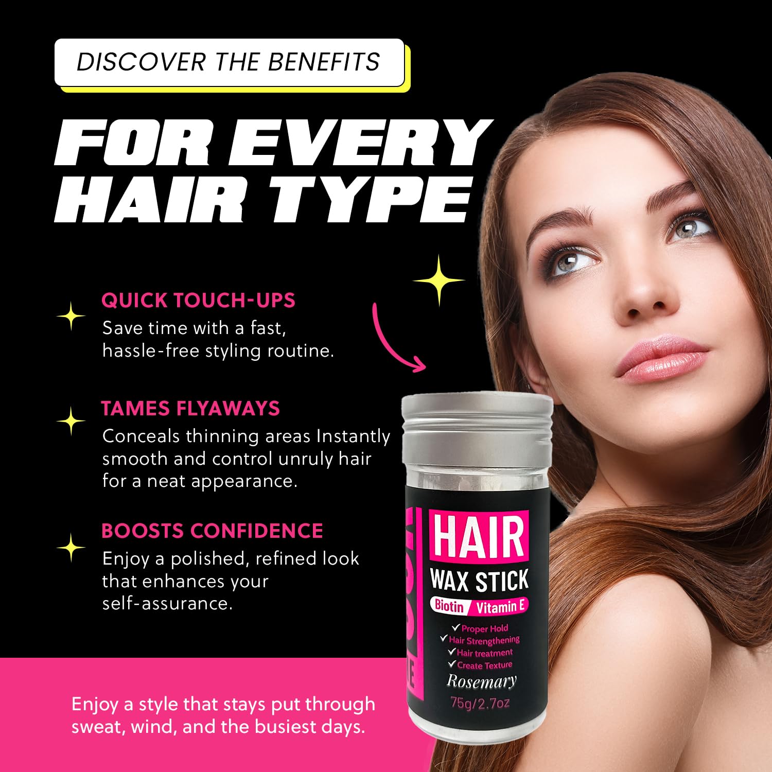 Hair Wax Stick 2.7 fl oz – Strong Hold, Tames Flyaways – Biotin, Vitamin E & Rosemary Formula – Hair Wax Stick for Men & Women, Slick Back Styles, Supports Healthy Hair for All Types