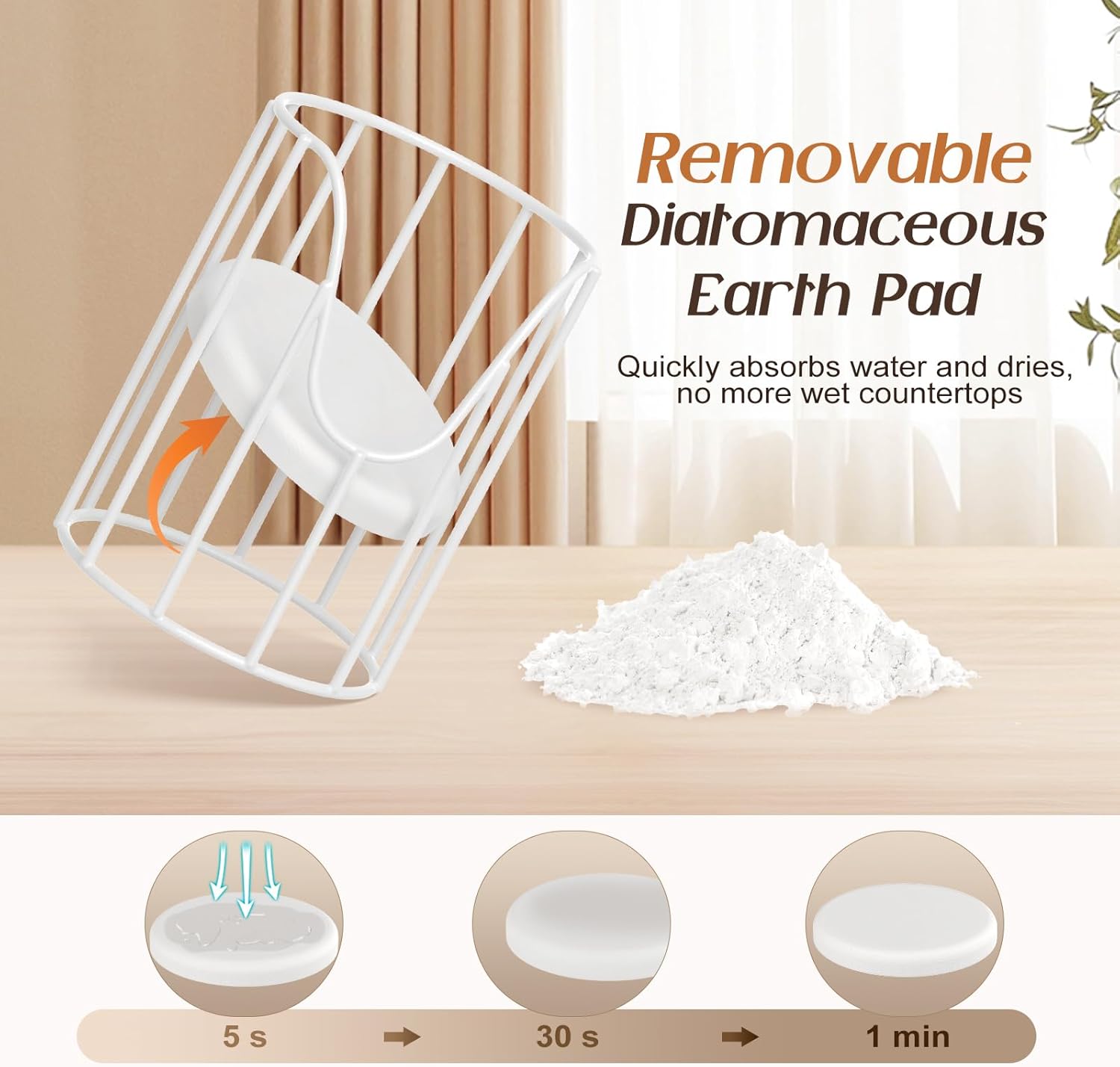 - Diatomaceous Earth Pad: The Dixie cup dispenser comes with a removable food-grade diatomaceous earth pad, which quickly absorbs water and dries in minutes. It effectively prevents plastic and glass cups from growing bacteria due to stagnant water. When the pad gets dirty, simply detach it and rinse it with water for easy cleaning and maintenance.