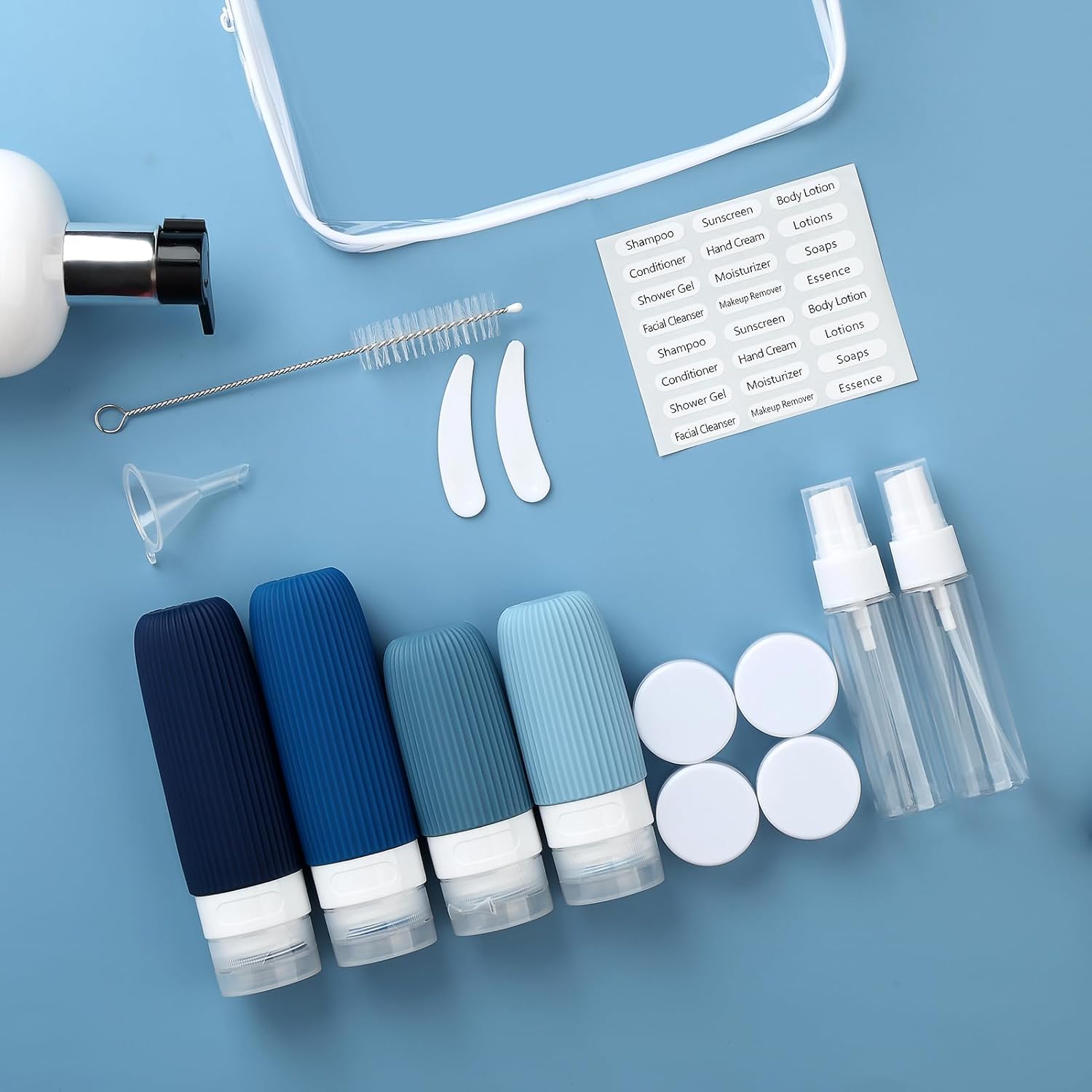 - Useful Travel Accessories: This is a nice assortment of travel containers in a useful zip case. ( Come in 4 Travel Bottles+4 Travel Jars+2 Spray Bottles+2 Scoopers+1 Funnel+1 Clean Brush + 1 Page Label + 1 Clear Toiletry Bag ) Multiple ones allow you take along different beauty products and toiletries according to your requirement