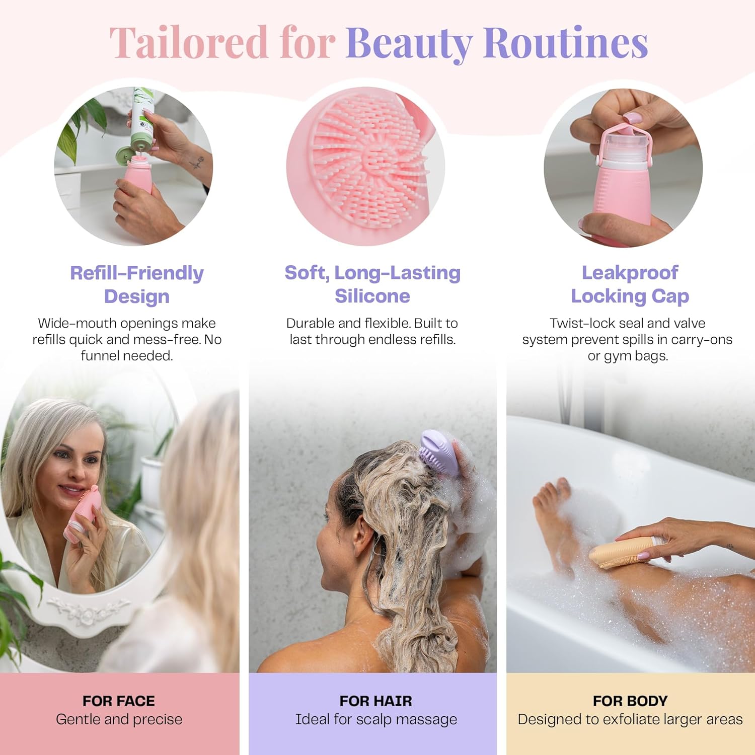 Sumina Silicone Travel Bottles 3 Pack (3.4oz) – TSA-Approved Leak-Proof Toiletry Containers with 2-in-1 Built-In Exfoliating Scrubber – Refillable for Travel, Gym & Skincare
